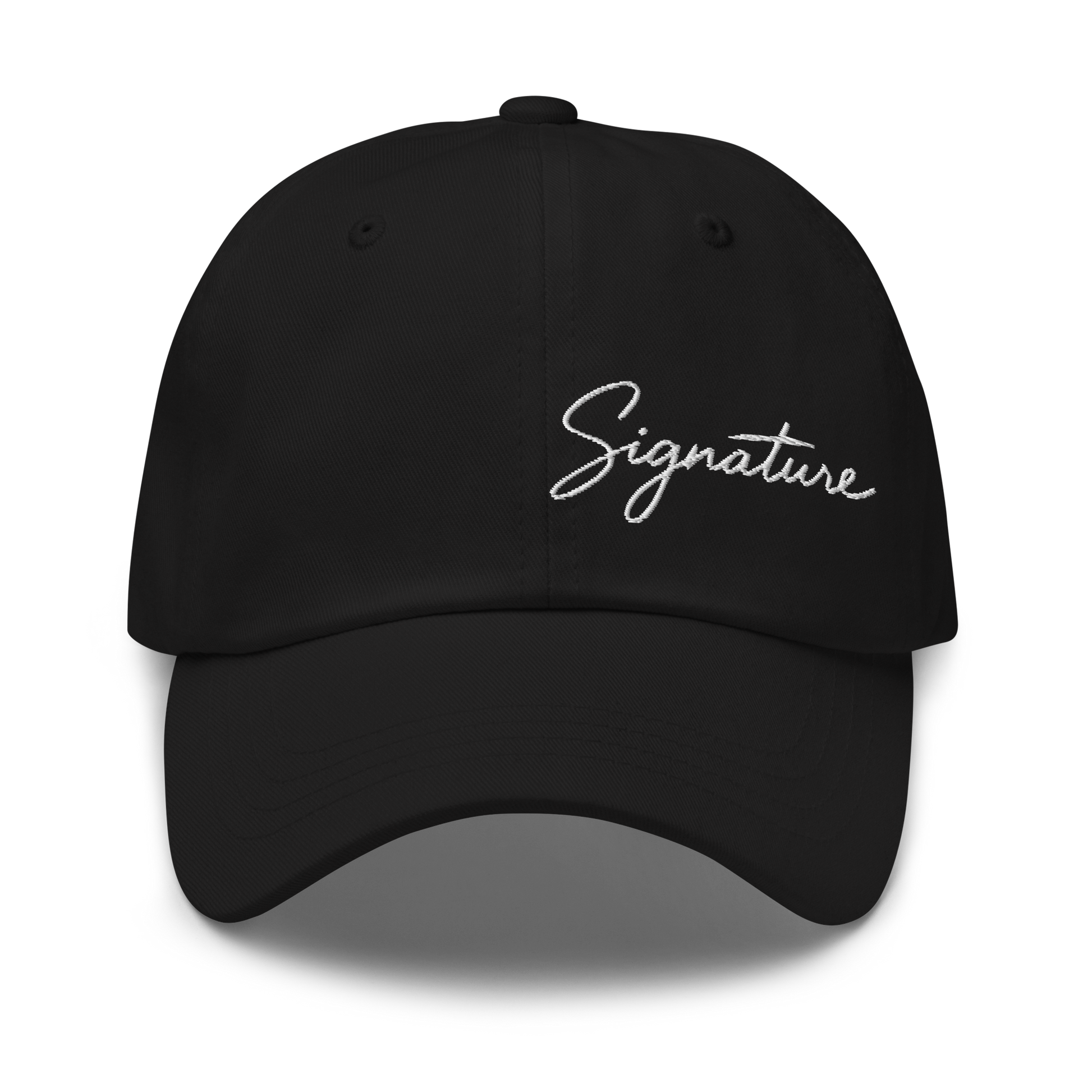 - Broderie frontale blanche : inscription manuscrite « Signature »